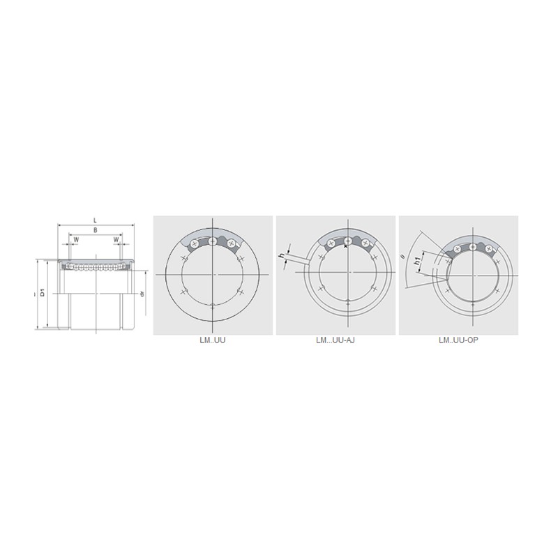 | LM ... UU | مدار | وزن (کیلوگرم) | LM ... UUجدیدAJ | مدار | وزن | LM ... uu-op | مدار | وزن (کیلوگرم) | مگنی | مگنی | تحمل | تحمل | d mm | تحمل (μm) | لیتر | تحمل (μm) | ب میلی متر | تحمل (μm) | W (MM) | D1 (میلی متر) | ح (میلی متر) | H1 (میلی متر) | θ | دقت | عالی | پویا | ثابت | |